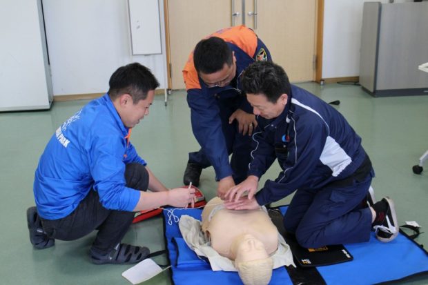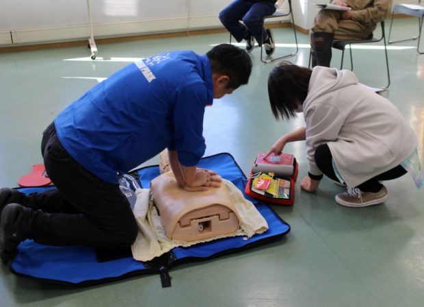 救急救命講習では、心肺蘇生法・AEDの使用方法について学びました。