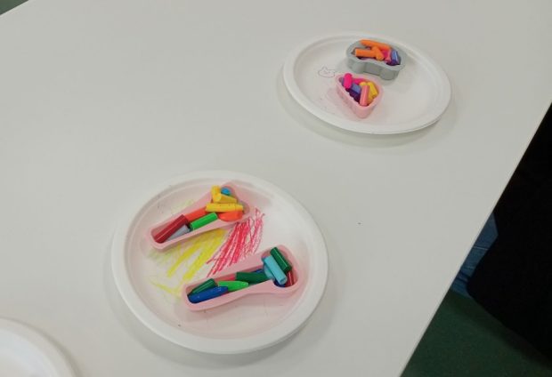 次はクレヨンをポキポキ折って型に詰めます。小さなお子様でもカンタンにできましたよ~🎶