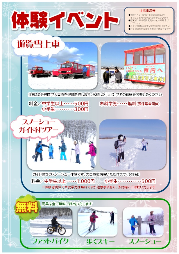 有料イベントは「遊覧雪上車」「スノーシュ―ガイド付きツアー」