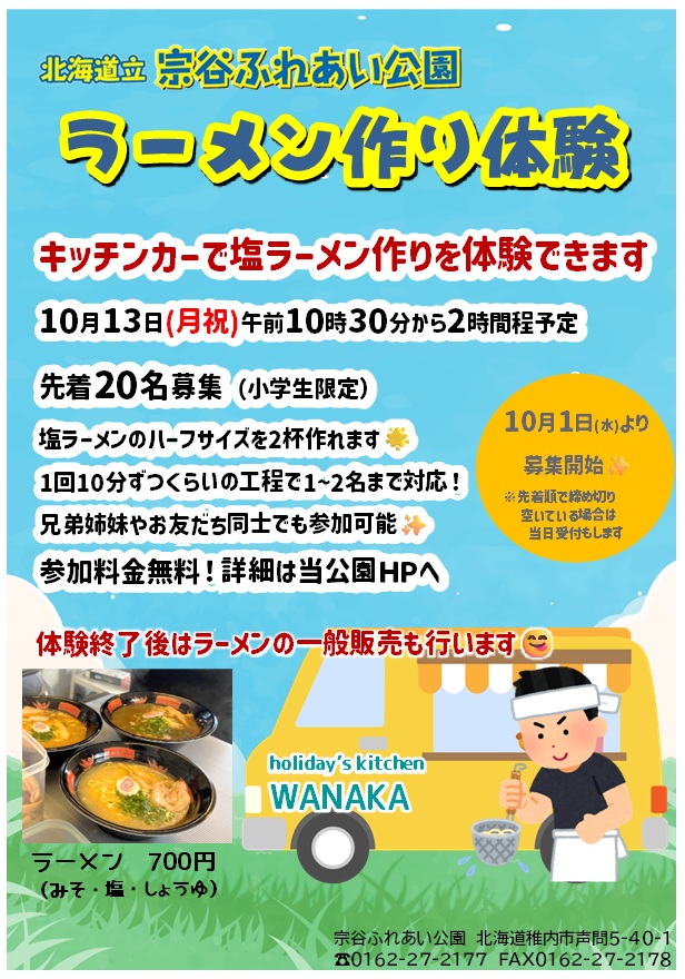10月13日(月祝)午前10時30分から「ラーメン作り体験」を開催します!