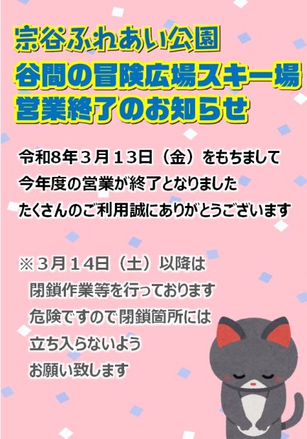 令和8年3月13日(金)をもちまして谷間の冒険広場スキー場の今年度営業を終了することとなりました。